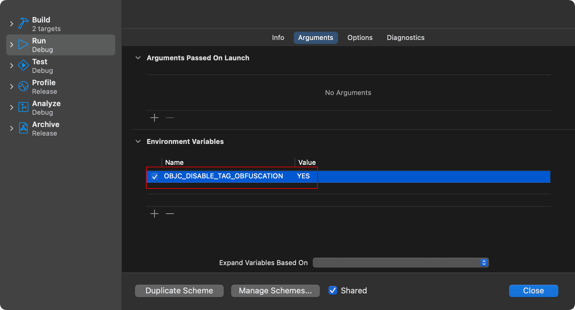 为了便于调试和观察 Tagged Pointer 的底层实现,我们需要关闭这个数据混淆功能。只需要将环境变量 OBJC_DISABLE_TAG_OBFUSCATION 设置为 YES 即可。