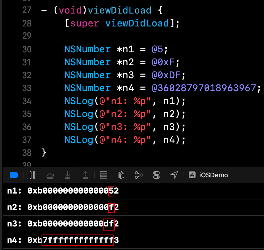 由于 NSNumber 的源码未开源,所以我们通过分析结果来了解 Tagged Pointer 的实现原理。以下是我的调试结果: